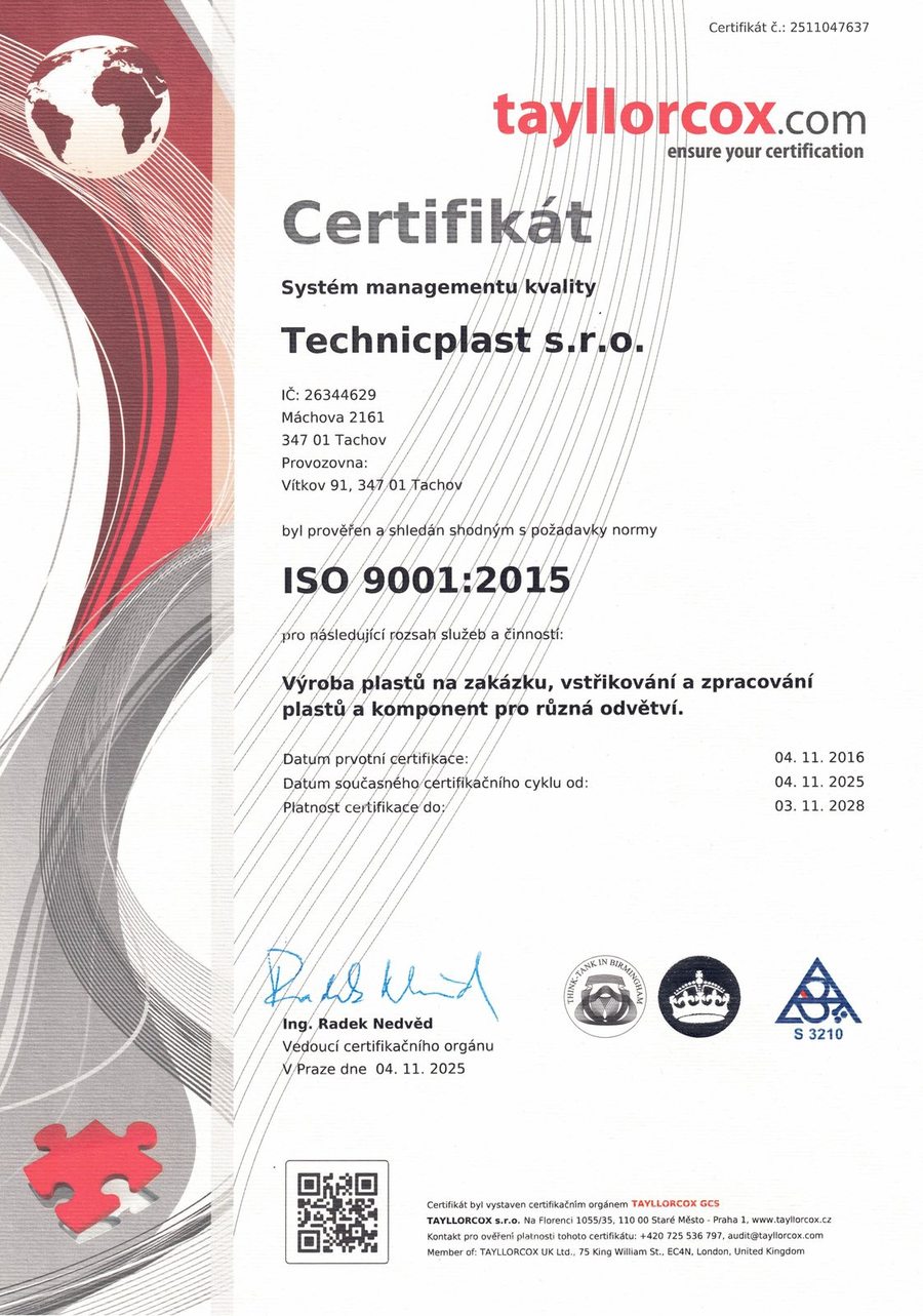 Vysokou úroveň zpracování plastů dokládáme také certifikátem kvality ČSN EN ISO 9001:2001.